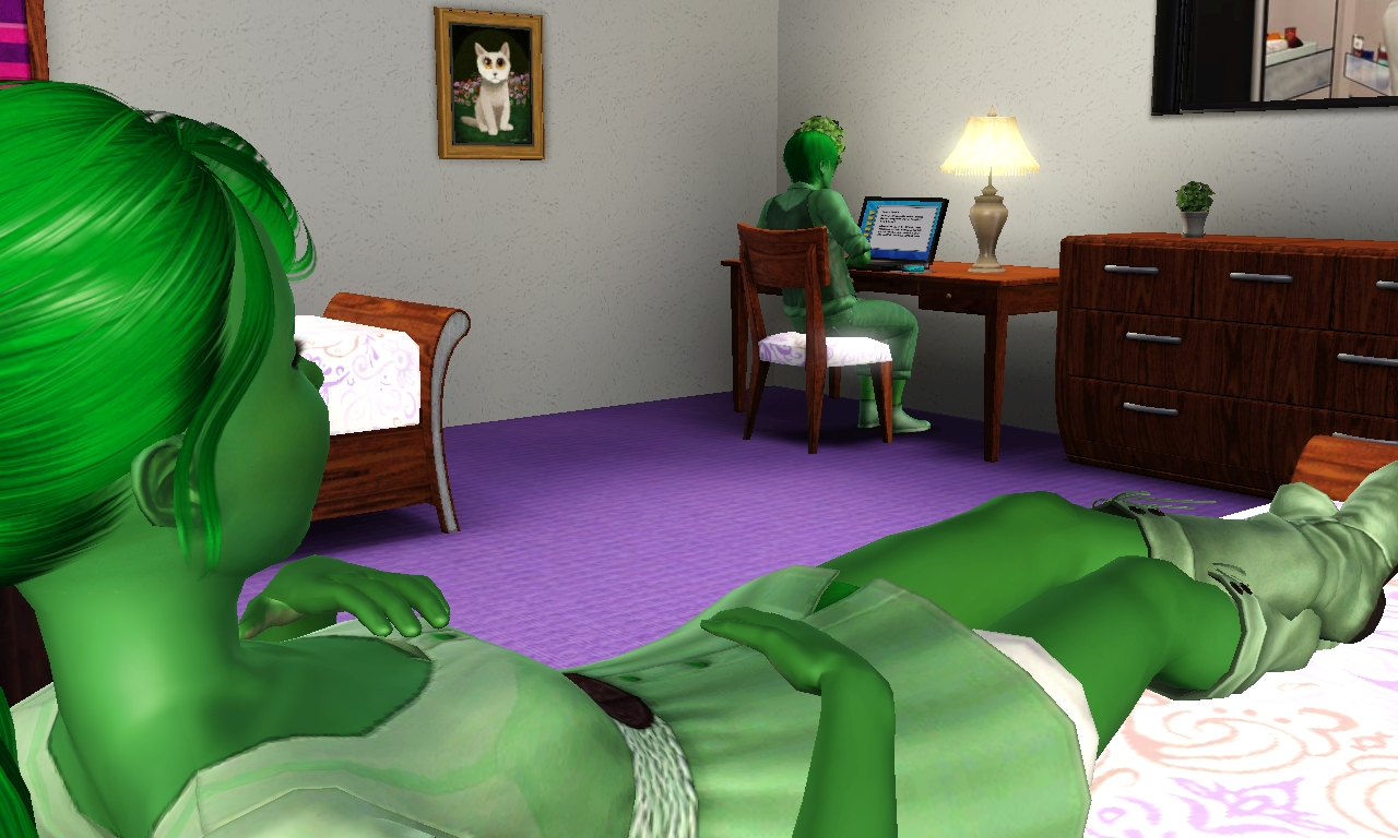 ReplyDeleteAny coincidences between my Mantis and the Mantis in that story are wholly unintentional. I just used the name Mantis because it's one I don't actually like, and I wanted to save my "better" green names for Sims with more importance. The green and purple- I was trying to use a color combination I hadn't used/shown so far in the story. Are the two character's background's similar? Because I can see how that would look suspicious.